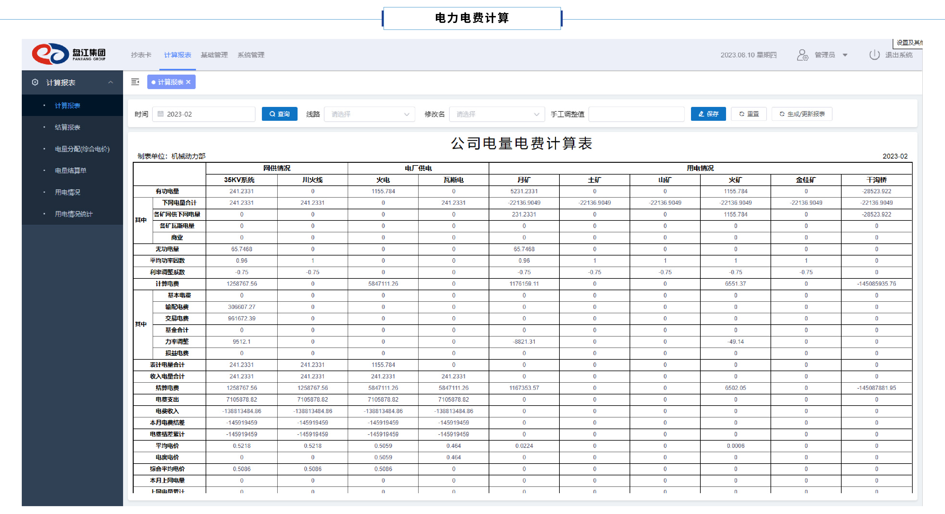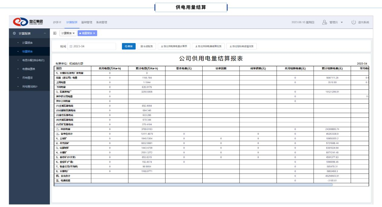 電量電費計算報表包含國網公司供電電量、電廠發電量數據,涵蓋有功電量、無功電量、力率調整系數、計算電量、結算電量、電費支付、月度電費結差、累計電費結差的數據報表。